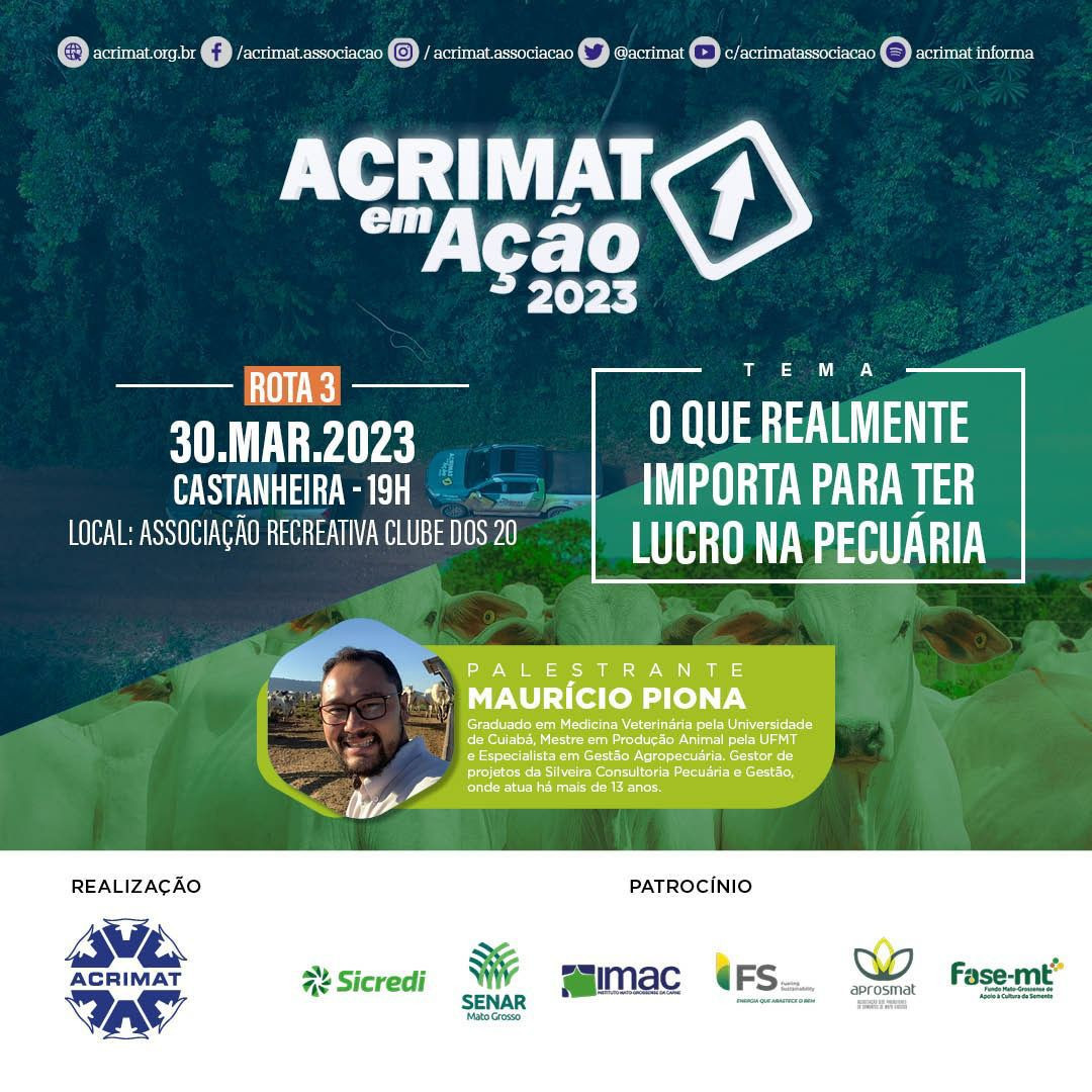 O tema deste ano – “O que realmente importa para ter lucro na pecuária” – será compartilhado por Maurício Piona, graduado em Medicina Veterinária pela Universidade de Cuiabá, Mestre em Produção Animal pela UFMT e Especialista em Gestão Agropecuária, com atuação em mais de uma década na área de gestão de projetos e consultoria.