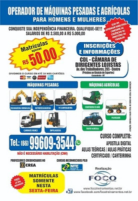 Outra informação importante é que a empresa Foco Treinamentos facilita o pagamento dos custos, dividindo o débito em três vezes nos cartões. O investimento é pequeno, comparando-se as perspectivas de ganho num cenário de grandes oportunidades, uma vez que Mato Grosso é referência nacional no setor agrícola. No caso de máquinas pesadas, o próprio município de Castanheira tem ampliado perspectivas para profisisonais da área. Com a qualificação que está sendo oportunizada, em pouco tempo o interessado estará habilitado a receber salários que variam de R$ 2.500,00 a 5.000,00. Detalhe: as mulheres estão entrando no segmento. Se interessou? Melhores informações podem ser obtidas no telefone (66) 99609 3544.
