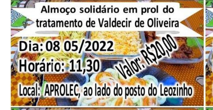 Sensibilizados com a sua situação, alguns amigos deram início a uma mobilização para levantamentos de fundos visando ajudar com as despesas do tratamento. O desfecho da ação acontece neste domingo, dia 08, Dia das Mães, na APROLEC, situada próximo ao Posto do Léo, onde um almoço será oferecido no valor de R$ 20,00. Os participantes concorrem ao sorteio de uma bezerra.