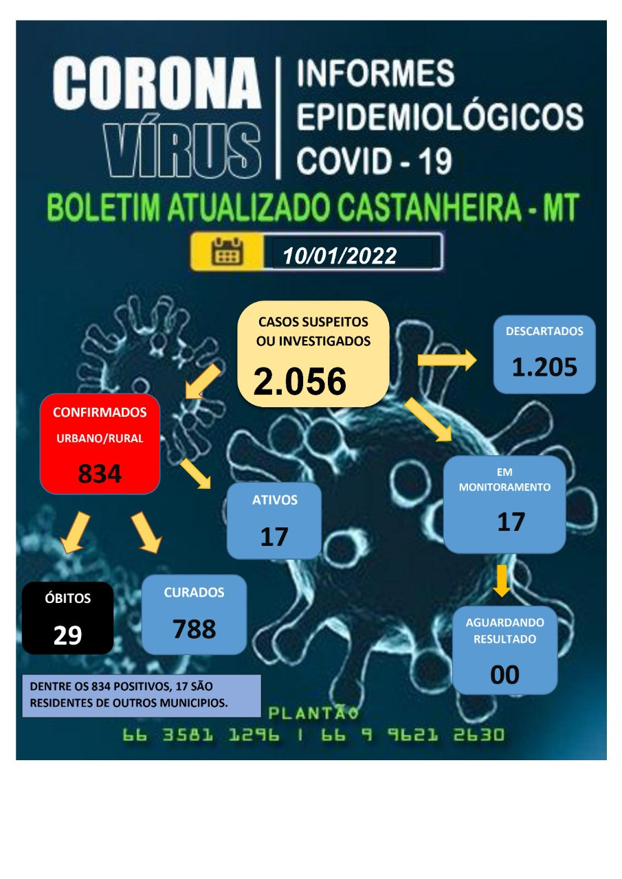 De 0 para 11, no final de semana. De 11 para 17, nesta segunda feira, 10. Esses os indicativos do Boletim Epidemiológico publicado pela Vigilância Sanitária em relação a casos ativos e em monitoramento da Covid 19 em Castanheira.
