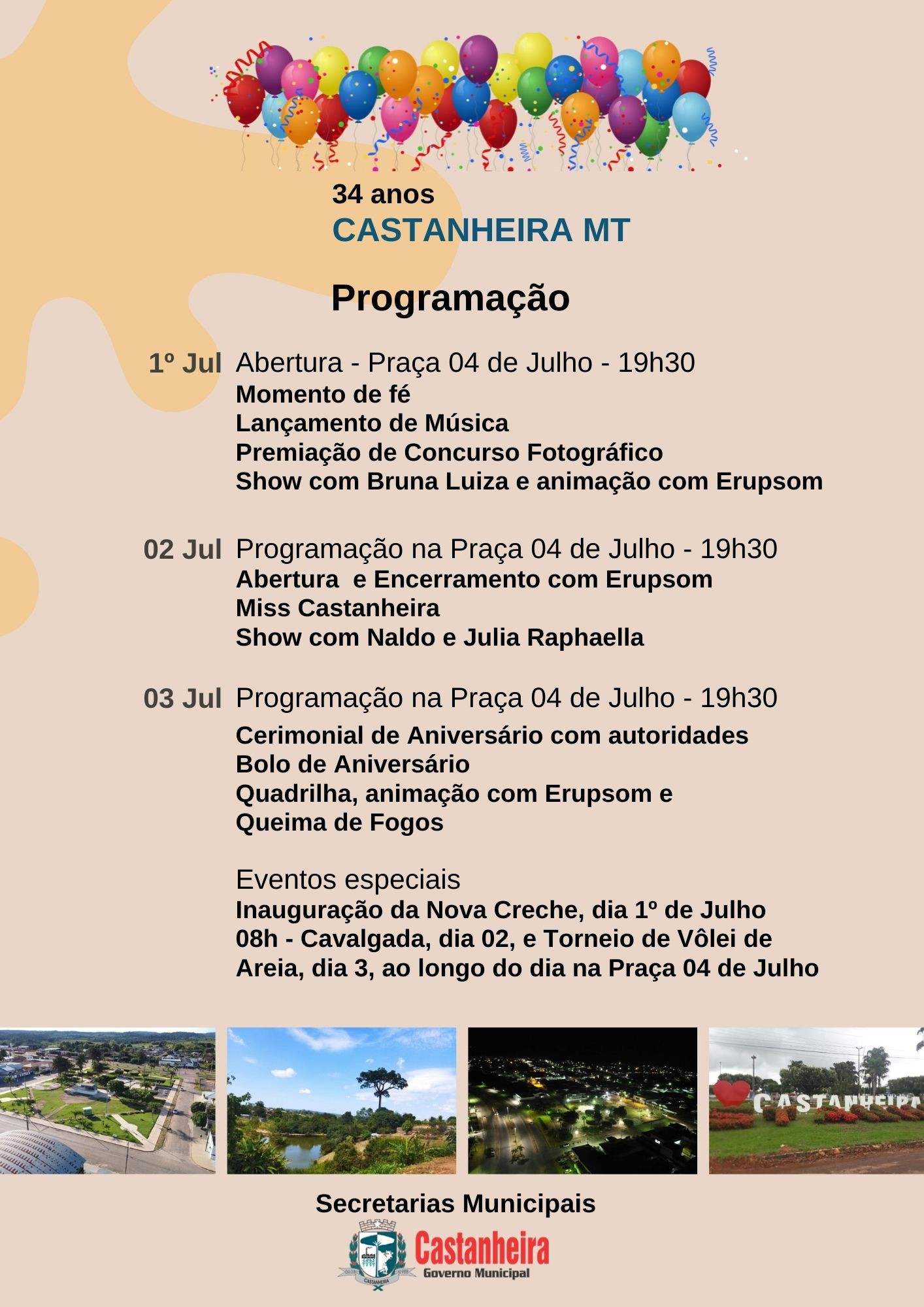 Os eventos começam no dia 1º de julho, uma sexta feira, com a inauguração da nova Creche Municipal Pequeno Príncipe, no Bairro Santa Rita. No mesmo dia, a partir das 19h30, começa uma série de três noites de atividades centralizadas na Praça 04 de Julho, onde haverá um espaço de alimentação, fomentado por algumas entidades, já estando definidas barracas do pastel, do caldo, bebidas, entre outras. Confira toda a sequência: