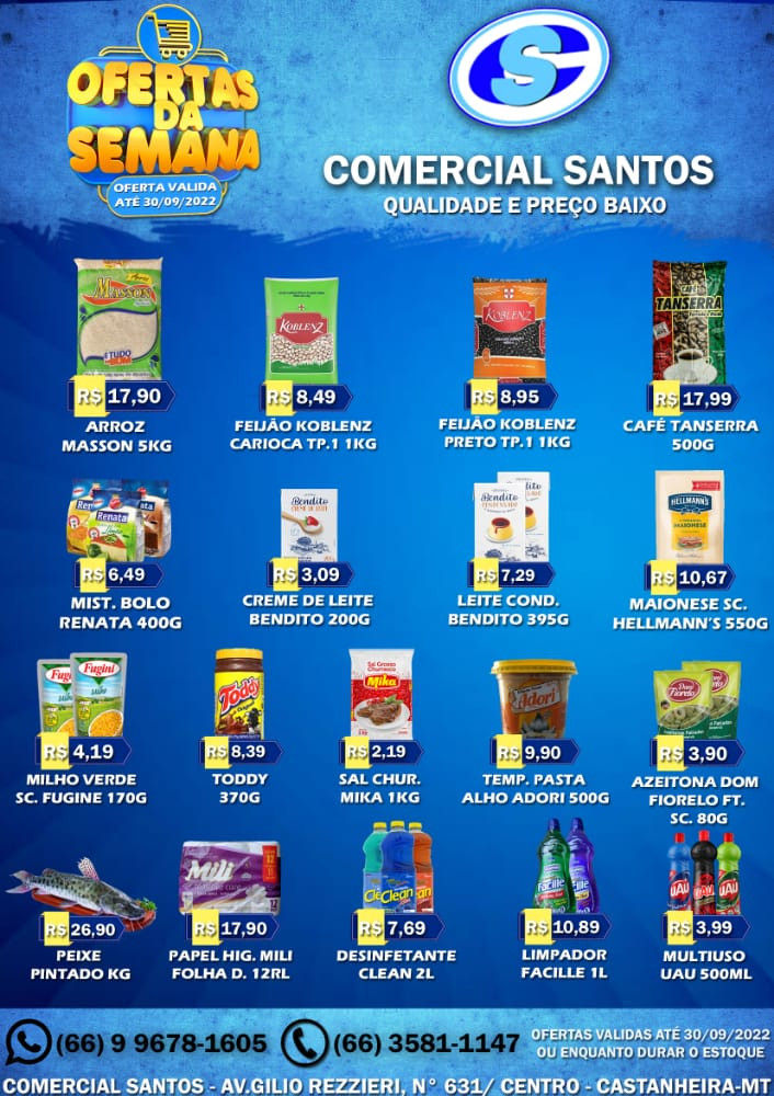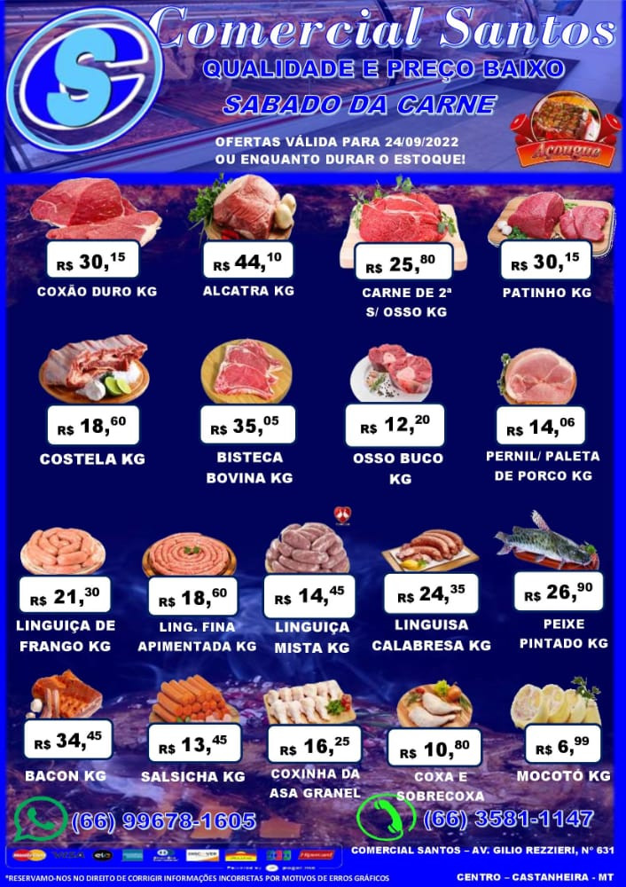 Chegou mais um sábado, dia em que o Comercial Santos disponibiliza três listas especiais de produtos com preços mais acessíveis: carne, frutas e verduras e das ofertas da semana, que, neste caso, prevalece até o próximo dia 30.