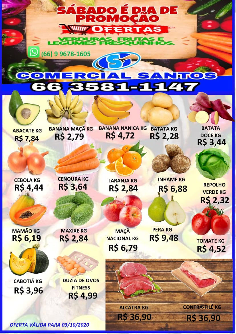 Então vamos lá comprar maxixe e também abacate, banana, cebola, batata, cenoura, laranja, mamão, repolho... etc? O Santos você já sabe onde fica. Mas, se não sabe, fica na Av. Gilio Rezzieri, 631, centro. Como neste caso quem se apressa compra os melhores exemplares dos produtos da lista, uma pergunta: já se arrumou para ir às compras? Quer conferir, antes, os preços? Então segue...