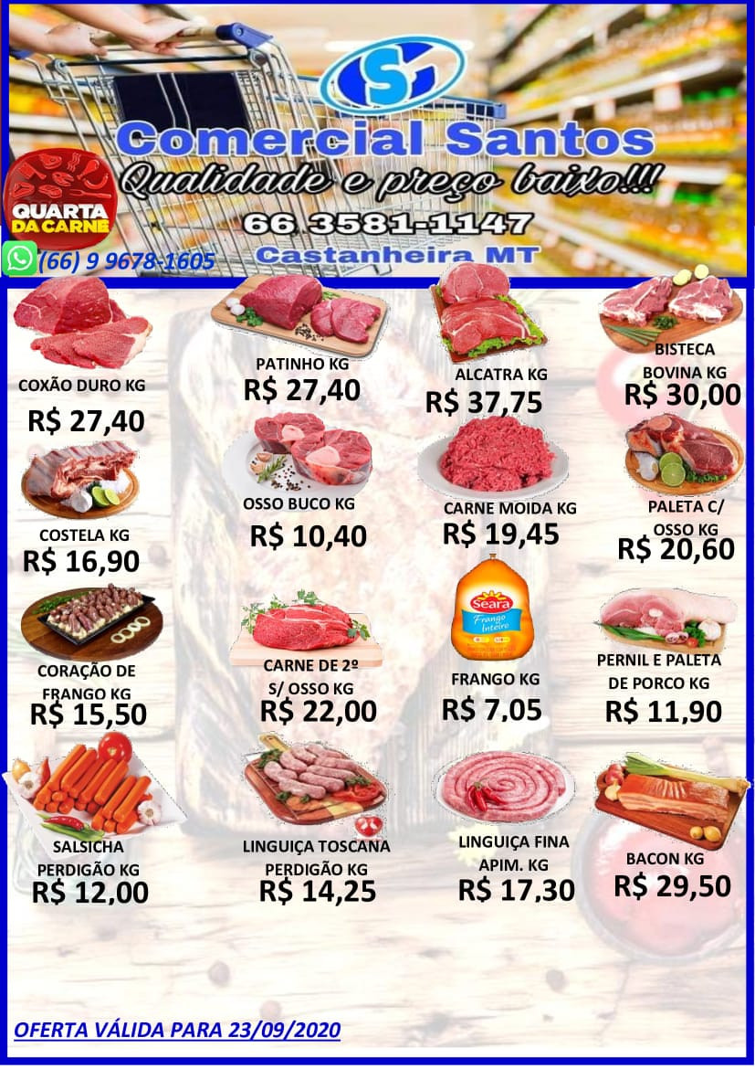 Nesta quarta, 23, o Comercial Santos, como já é tradição, oferece todos os produtos de açougue a preços mais acessíveis ao consumidor. Confira, a seguir, a cotação de hoje: