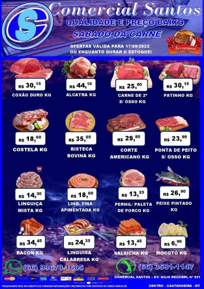 A “carne de peixe” está representada na lista de produtos com preços mais acessíveis neste sábado, 17, no Comercial Santos. E mais, de um das espécimes mais apreciados quando o assunto é culinária, a do pintado, peixe de água doce com maior valor comercial no país, apreciadíssimo pelo sabor de sua carne branca, sem espinhas, de consistência firme e com o potencial nutricional já indicado.