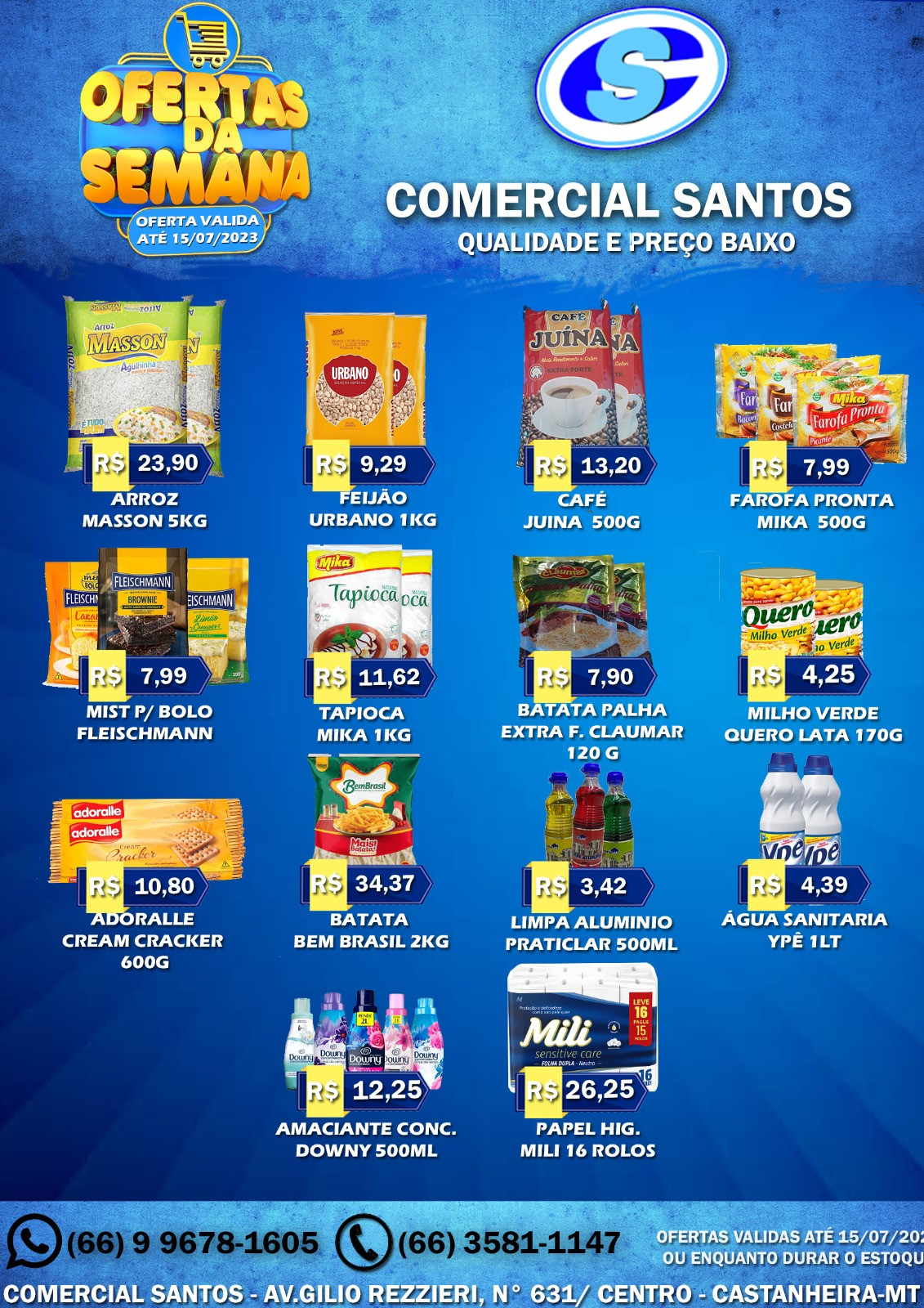 Fechando o pacote de bondades do Vanderlei, a lista de “ofertas da semana” continua disponibilizando, a preços mais acessíveis, entre outros, arroz, feijão, café, etc. Em resumo, tudo que é fundamental para a sua alimentação tem, no Santos, descontos que fazem valer a pena uma visita. E como “economizar é preciso...”