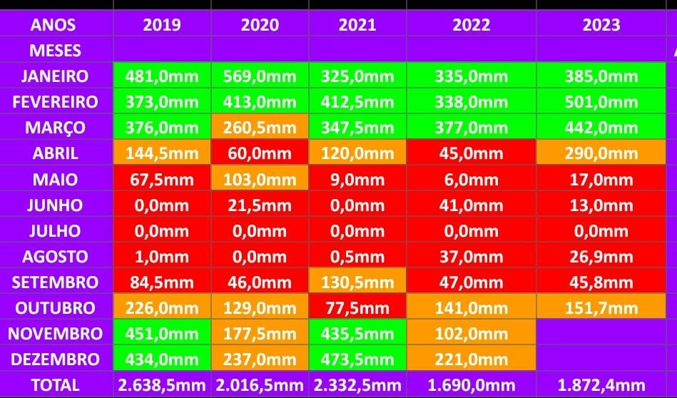Abaixo você pode conferir os volumes de chuva dos últimos outros.