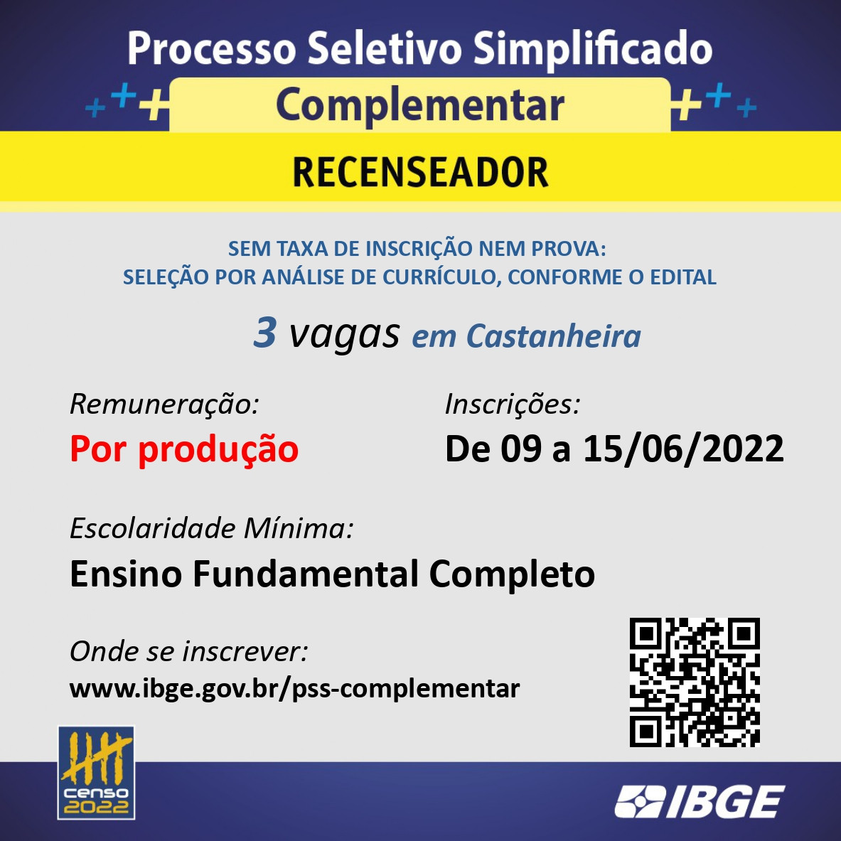 O IBGE encerra na quarta-feira (15) as inscrições do processo seletivo simplificado complementar para 48.535 vagas de recenseador para o Censo Demográfico 2022. As vagas são para nível fundamental completo e estão distribuídas em todas as unidades da Federação.