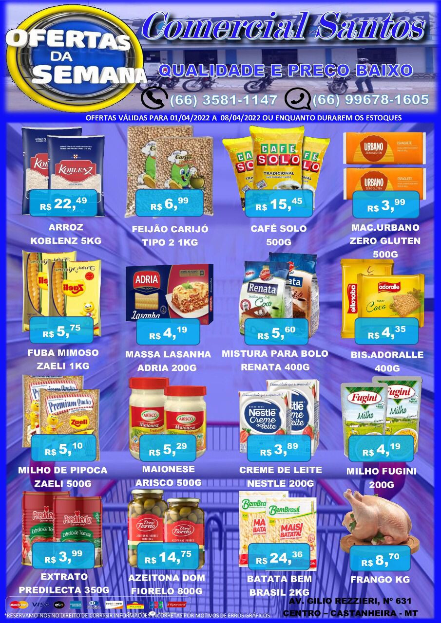 Animou-se para comprar? Apresentamos outra razão: além dos vários produtos em descontos na semana (confira abaixo), sábado é o dia de descontos especiais também na carne, frutas e verduras. Com a alta de preços estimulada por um conjunto de fatores, é bom aproveitar o sábado para fazer um boa compra. O Santos, você já sabe, fica na Gilio Rezzieri, em frente o Sicoob. Lembrando, ainda, a propósito do frio, que você pode desfrutar da lanchonete do Santos, onde você degusta os melhores salgadinhos da cidade.