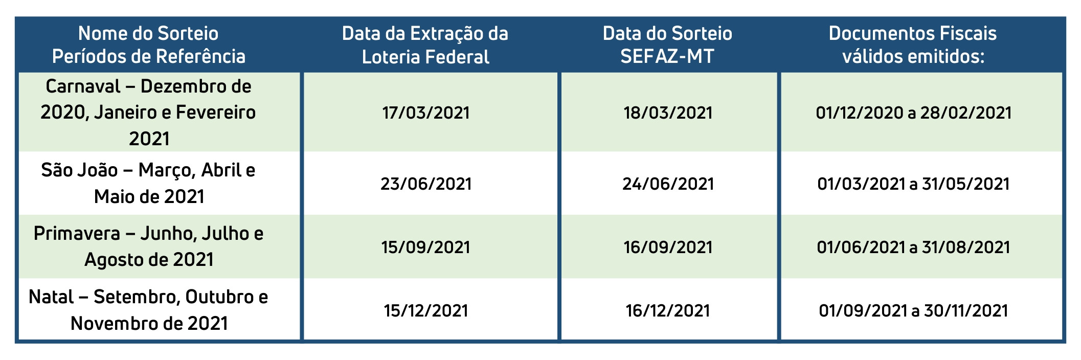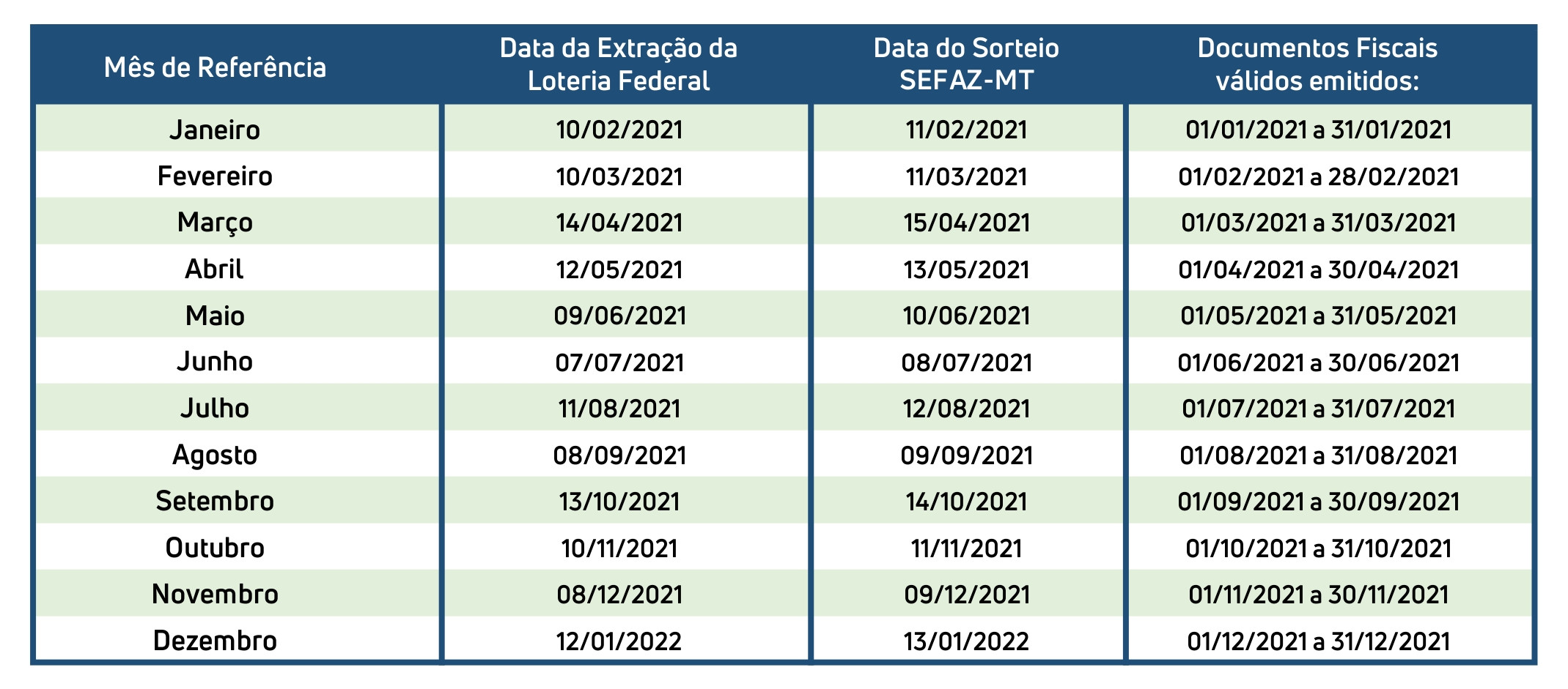 Os sorteios serão realizados com base nas dezenas da Loteria Federal, da Caixa Econômica Federal, sempre no mês posterior à emissão do documento fiscal. Por exemplo, os documentos emitidos em janeiro concorrerão aos prêmios sorteados no mês de fevereiro. No caso dos sorteios mensais, sempre na segunda quinta-feira de cada mês. E os sorteios especiais na terceira.