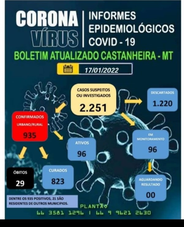 Nesta segunda feira (17), Castanheira atingiu o mais elevado índice de cidadãos contagiados pela COVID 19, desde o início de sua primeira manifestação, em meados de 2020. Boletim Epidemiológico indica a existência de 96 casos positivos no município.