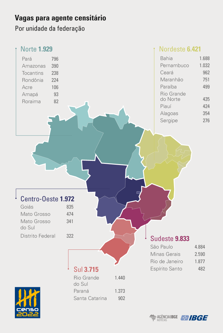 São oferecidas 183.021 vagas para recenseador. Para concorrer, os candidatos precisam ter o ensino fundamental completo. Os recenseadores do IBGE atuarão diretamente na coleta das informações nos mais de 70 milhões de domicílios do país. O profissional ganha por produção. Clique aqui para simular a remuneração.